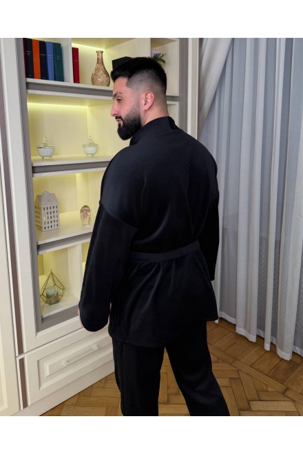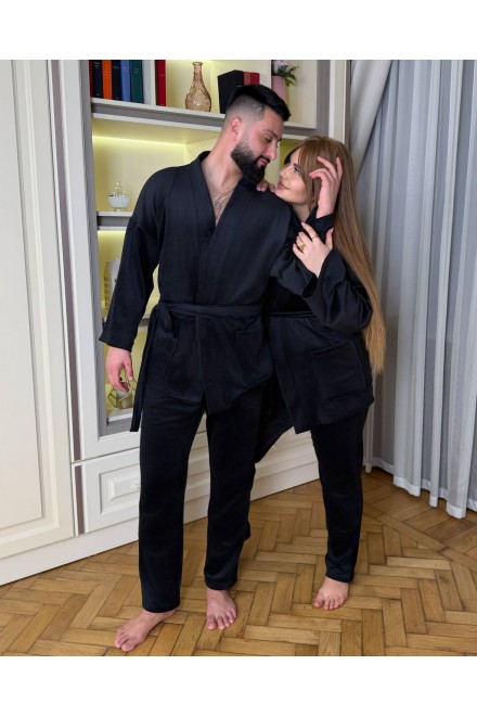 Кімоно вільного крою, на запах,з широкими рукавами та поясом,який красиво підкреслює талію.Штани прямого крою,із зручною резинкою на поясі та кишенями.