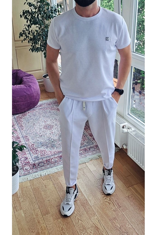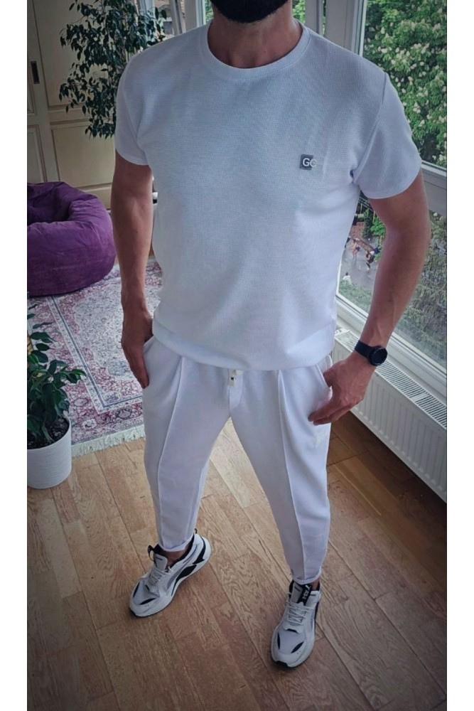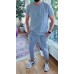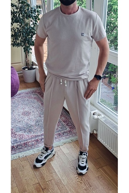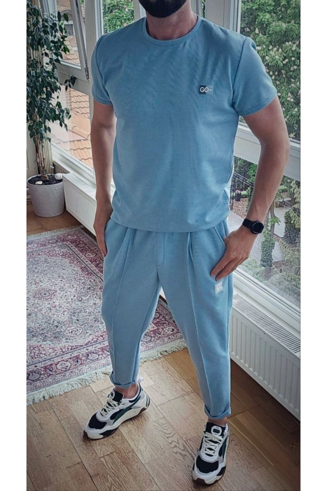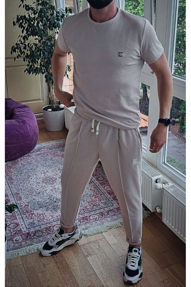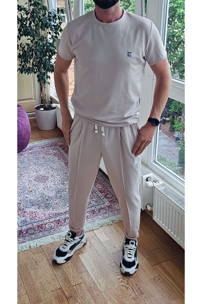 Футболка з фактурною текстурою,декорована силіконовою нашивкою на груднях.Штани з еластичним поясом,шнурком,бічними кишенями та силіконовою нашивкою.
