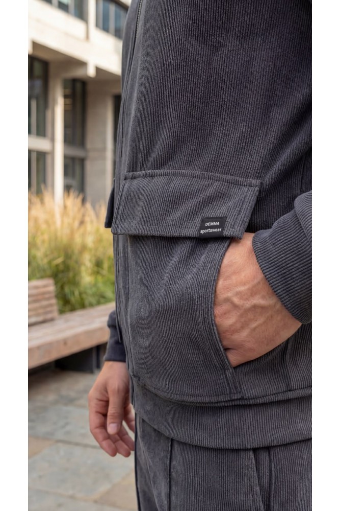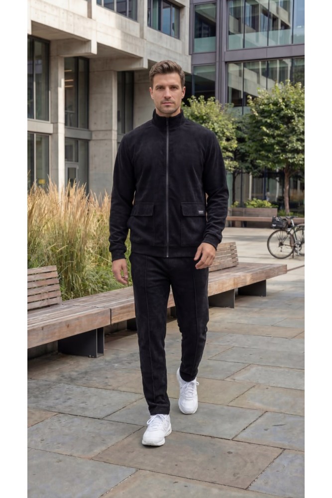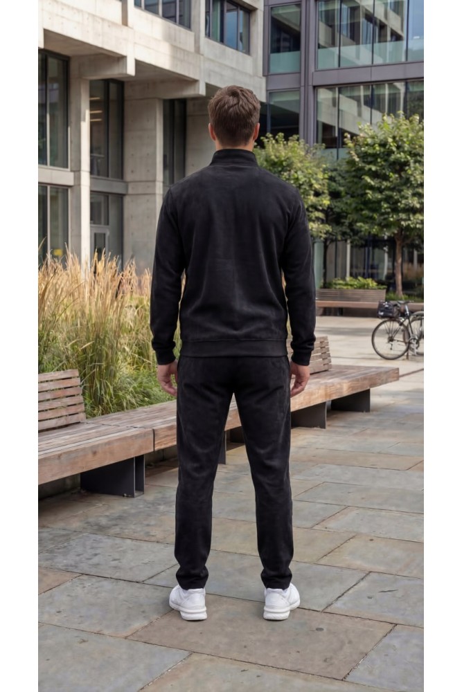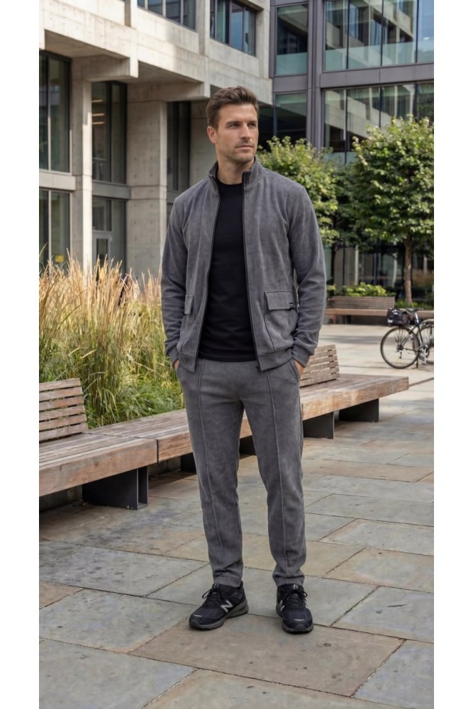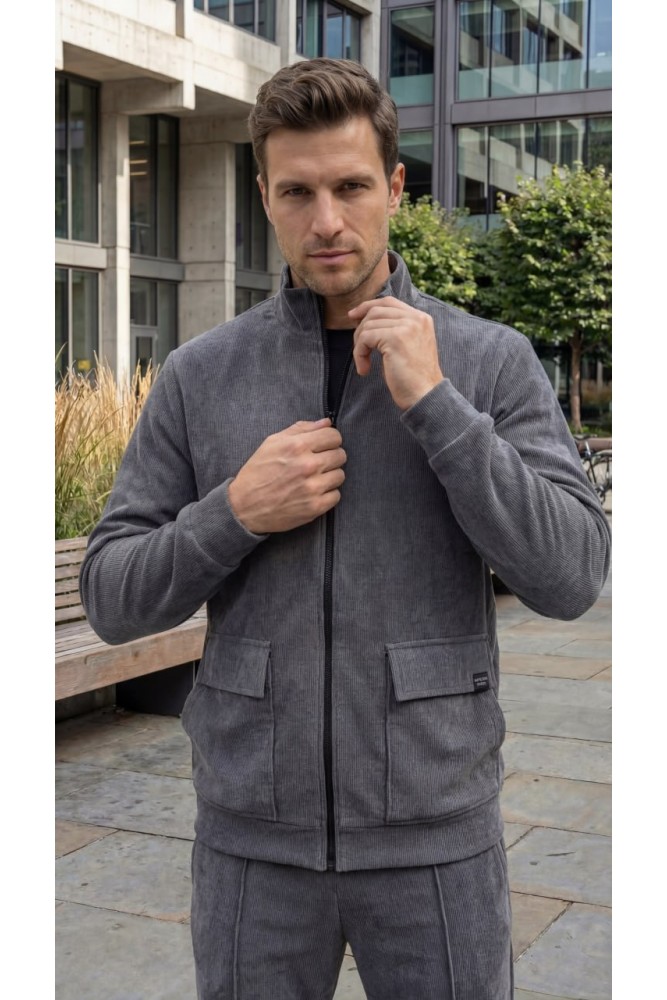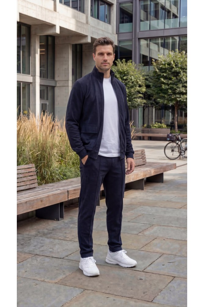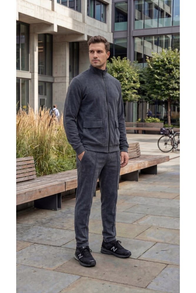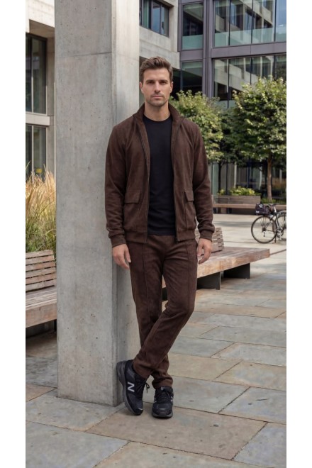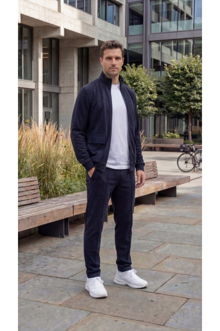 Чоловічий повсякденний костюм складається з куртки-бомбер на блискавці та прямих штанів. Костюм виконаний з м'якого матеріалу, Лакоста-вельвет, виробництва Туреччини