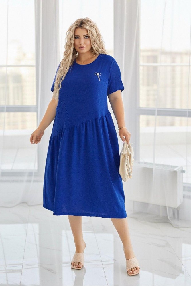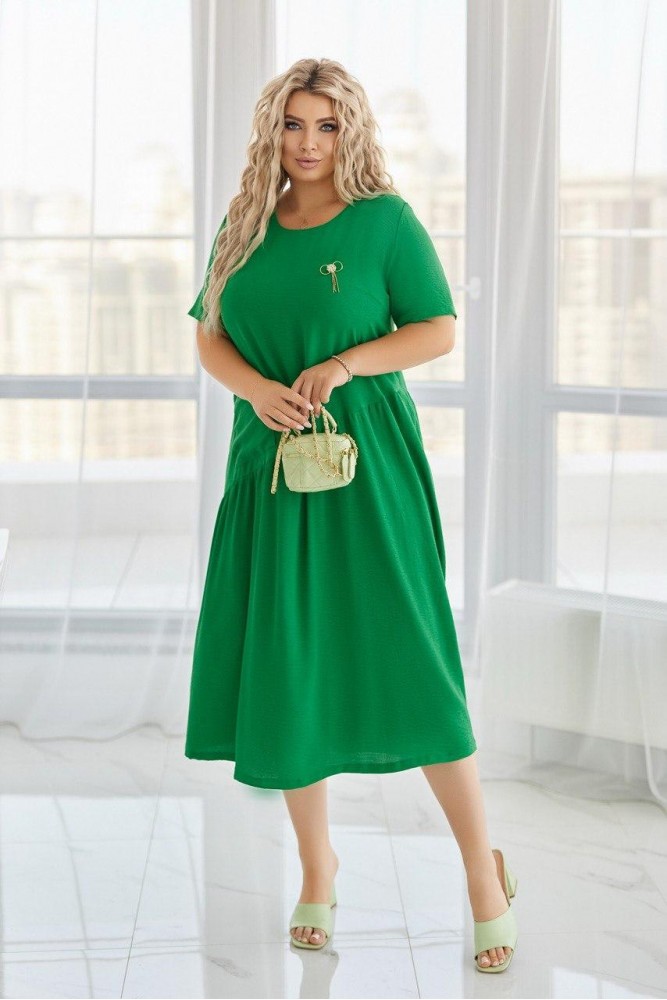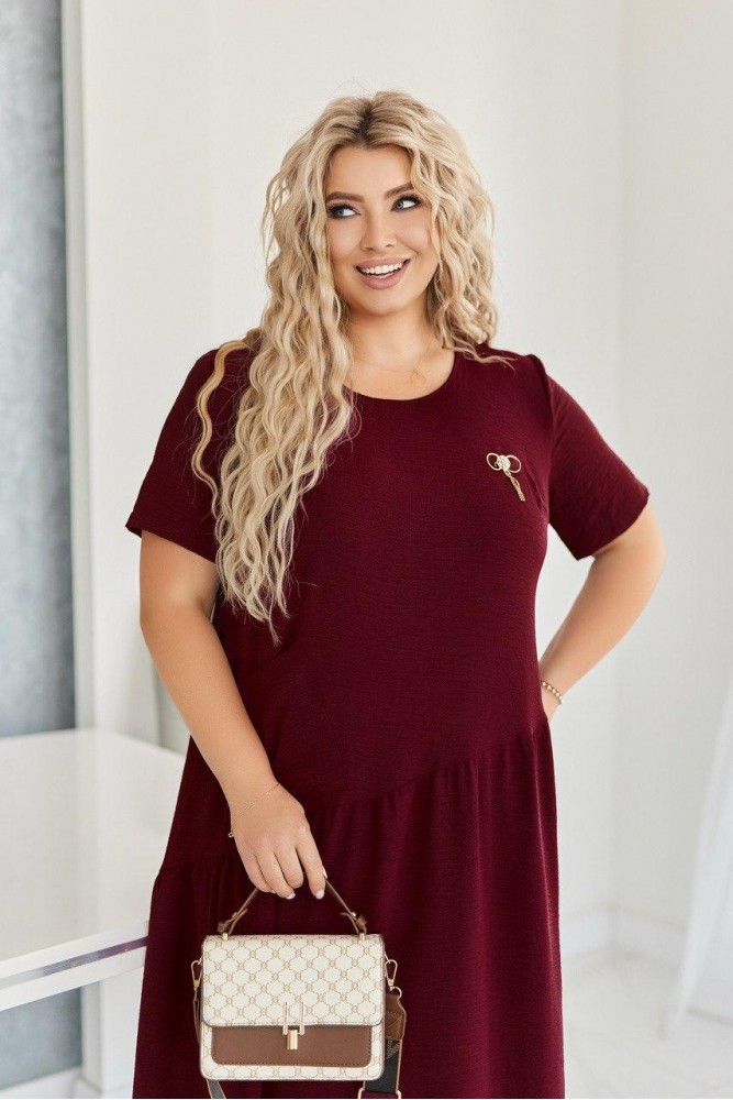 Сукня сучасного стилю, з косою лінією талії, прикрашена трендовою брошкою. Брошка може змінюватись.