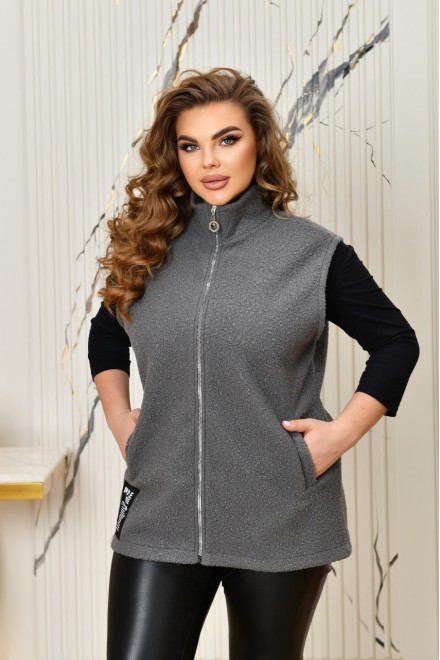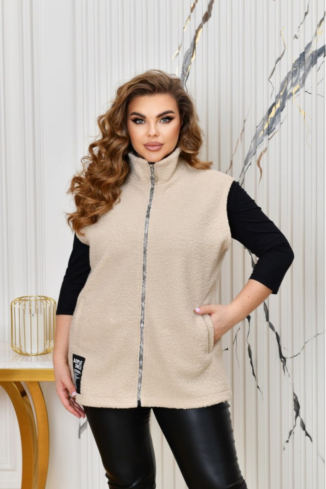 Актуальна стильна жилеточка із буклє «баранець» ( розтяжність мінімальна). Горловина з високою стійкою. Попереду оброблені прорізні кишені. Застібається на блискавку. Підкладу немає. Жилетка декорована якісною нашивкою.