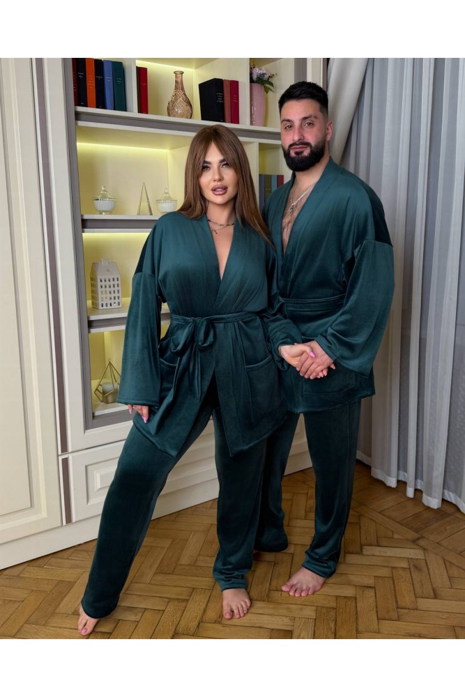 Кімоно вільного крою, на запах,з широкими рукавами та поясом,який красиво підкреслює талію.Штани прямого крою,із зручною резинкою на поясі та кишенями.
