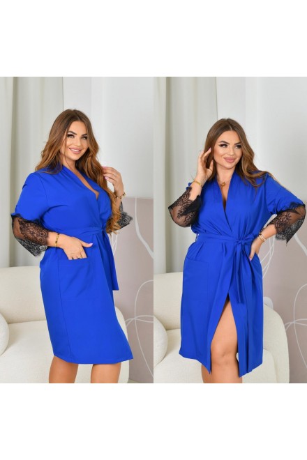 Ніжний, жіночний халатик на запАх (виготовлений із софту, тканина розтяжності не має). Силует прямий, вільний, під пояс. Є накладна кишеня. Рукави довгі, декоровані неймовірно гарним, якісним мереживом.