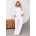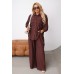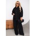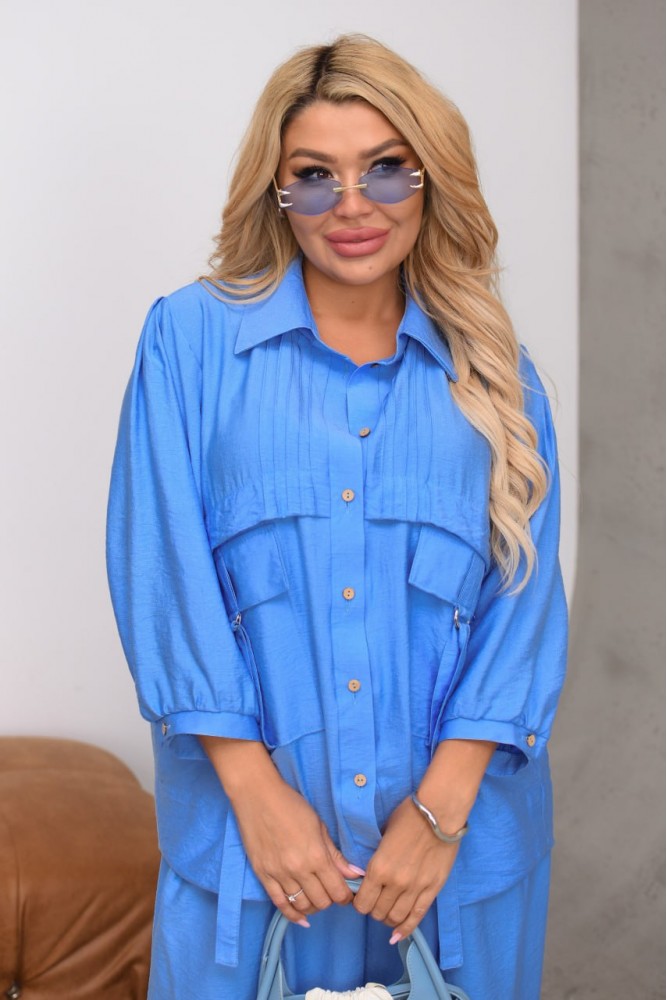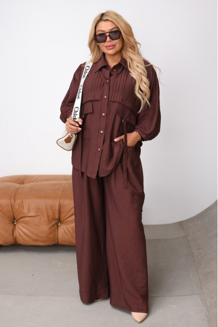 Вишуканий костюм, що поєднує комфорт, практичність і сучасний дизайн. Ідеальний вибір для повсякденних образів, роботи або стильних виходів — виглядає легко, але водночас елегантно.Сорочка вільного крою з накладними кишенями, декорованими клапанами зі стрічками, які плавно переходять до низу виробу та додають образу оригінальності. Перед оздоблений делікатними складками (“гармошкою”) в зоні грудей, що створює м’який, жіночний акцент.Застібається на ґудзики, рукав 3/4 із фіксацією на ґудзик — зручно та практично для щоденного носіння.Штани вільного крою з високою посадкою та еластичною резинкою на поясі забезпечують комфорт протягом усього дня. Бічні кишені додають практичності, а легкий силует виглядає сучасно та невимушено.Костюм легко комбінується як із класичним взуттям, так і з casual-варіантами — універсальна база гардероба.
