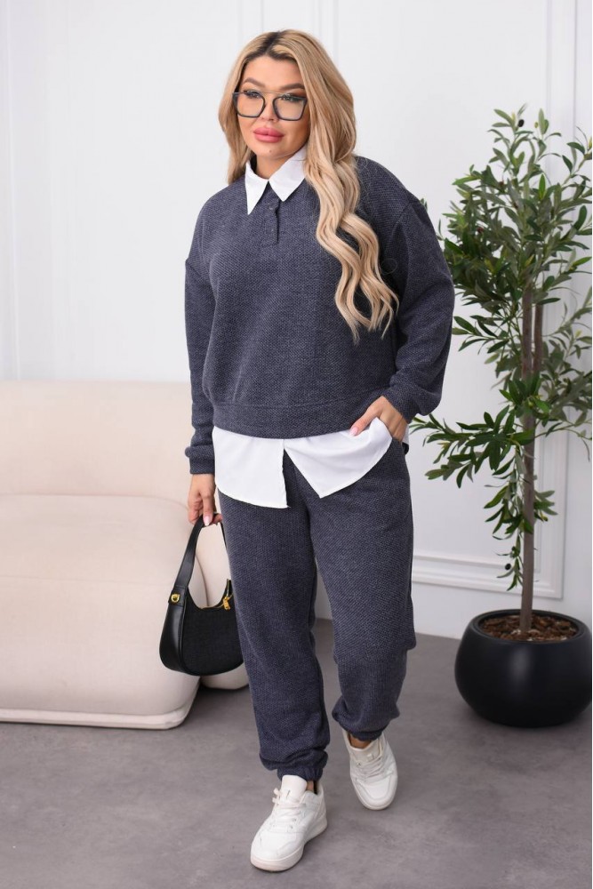 Кофта оригінального крою з ґудзиками ,виконана з вʼязаного трикотажу з додаванням білого супер софта на комірі та знизу з імітацією сорочки. .Штани на резинці з кишенями.