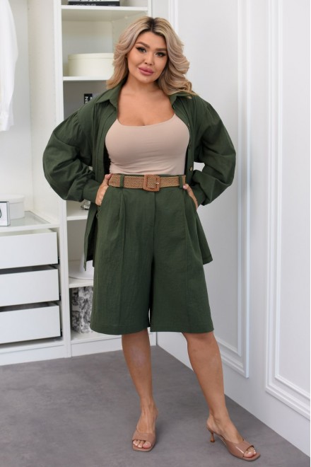 Стильний комплект із легкого жатого льону — ідеальний вибір для літньої спекотної погоди! Вільна сорочка та шорти на резинці дарують свободу рухів і комфорт у будь-яких ситуаціях. Пояс у комплекті підкреслить вашу талію та додасть образу завершеності.