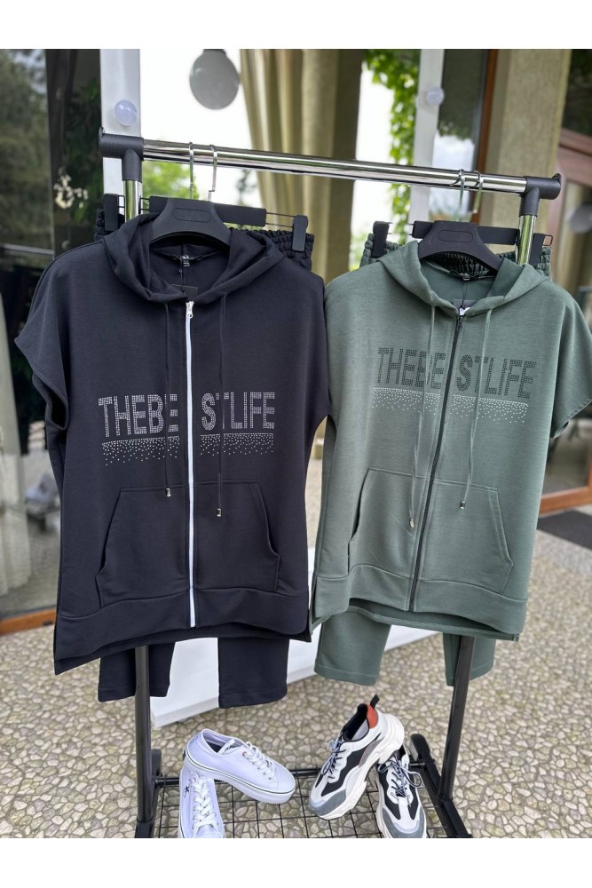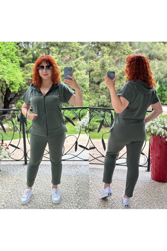 Куртка прямого силуету, з капюшоном, в куліску якого протягнуто шнурок. Застібається на блискавку. Рукав цільнокроєний, короткий. На передній полочці оброблено накладну кишеню. Низ асиметричний, з боків невеликі розрізи. Куртка декорована якісною аплікацією із стразів.